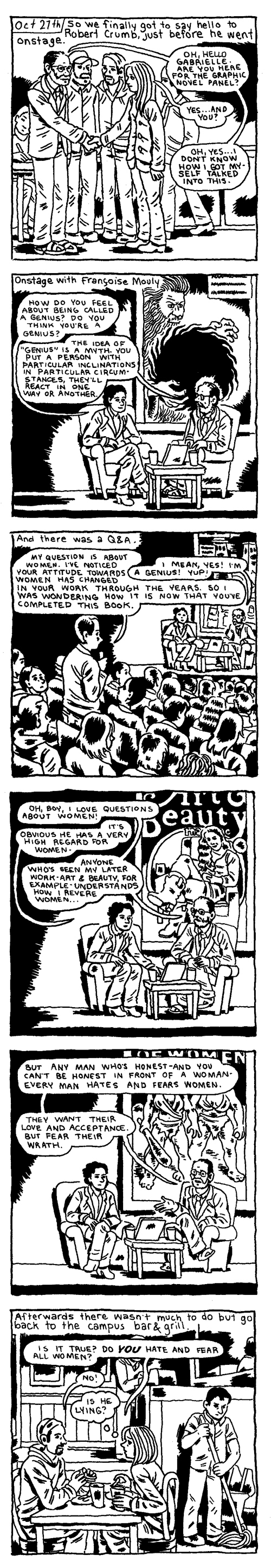 R. Crumb is a beautiful draftsman and sometimes an eloquent polemicist, but his take on women (not to mention, say, blacks or asians) are for the most part fucking gruesome. That’s his problem, and he’s admitted as much in his work (and has graciously allowed us to rubberneck the train wreck that is his psyche). But when he starts talking like his neuroses are part of the Y chromosome itself — and then I watch as the fanboys begin to nod and shrug and AGREE with him — then things have seriously gone pear-shaped. Check yourselves.