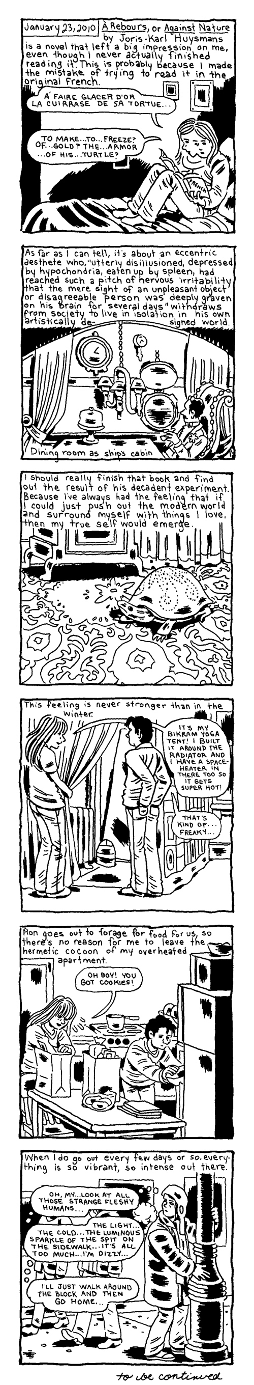 Huysmans, realizing the gravity of his physical condition, fashions a yogic tent from fine Persian silks in his study, carefully controlling the temperature and humidity inside his new gymnastic apparatus, thus being able to consciously manipulate and calculate every single bead of sweat on his tired brow.