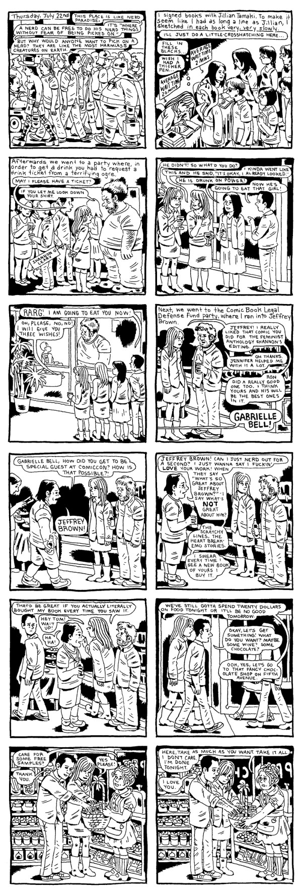 Thanks for writing these; the Jeffrey Brown scene is really well done (it’s also interesting to see him drawn by someone other than himself. I’m so used to his stylized drawing of himself that whenever I see a picture of him or someone else draw him I wonder why he doesn’t have a giant head and tiny neck).