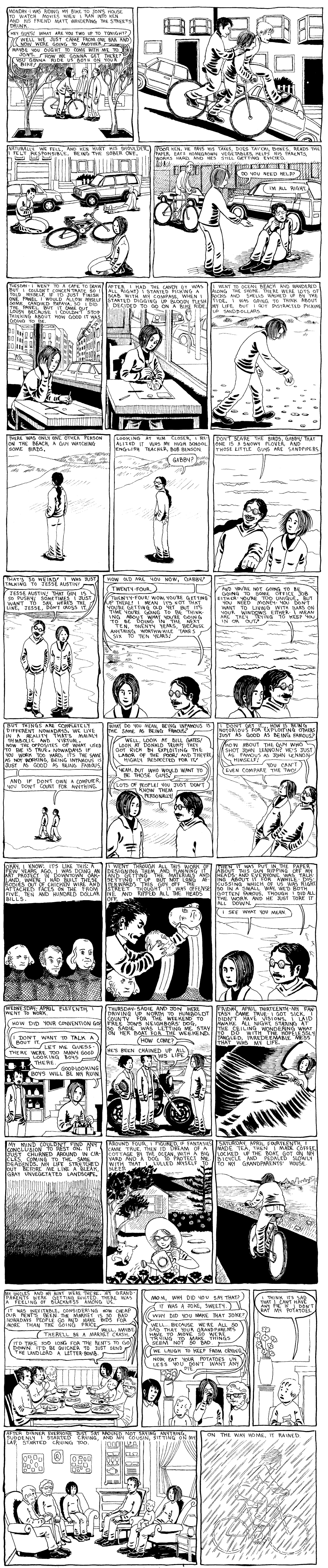 I absolutely loved your drawings and depiction of Bob B…That was hilarious what he said about Jesse Austin…Of course JA is always looking for the line, so that he could cross it…I knew them both that summer at Upward Bound…I taught left-wing economics…You were not in the class, but mysterious Sadie was…You are such a wonderful artist…I could look at your stuff all day…I love your quiet sentiments, and heartfelt cartoon people…They make me want to cry, and smile, and get it up and do something with my life…You’re drawings of Bob are totally on target…And his non-stop talk sounded just like him…You have a wonderful gift…I particularly loved the panel of you in the sun hat, watering the cottage plants in your fantasy…I am in Vancouver BC, teaching eco at BCU…Tell Sadie she was right about the strudel…Rita…