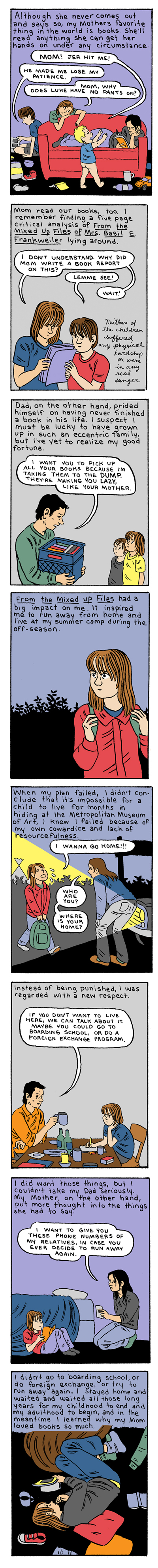 I wonder about the males in this country when not reading books is a point of pride, mild disdain or lack of concern for children who run away is acceptable, and criticizing your wife in front of your children is somehow okay as a teaching moment. Maybe I’m grinding an axe here, but your father isn’t a very sympathetic character in this comic. Your mother (and her kids by extension) seems like she suffered a lot in an environment without much support. On the other hand, story aside, as a work of art, this comic is very moving for the real-to-life characters and they way they are portrayed visually as well as narratively. Congrats on the honor of being published in Best American Comics for 2009.