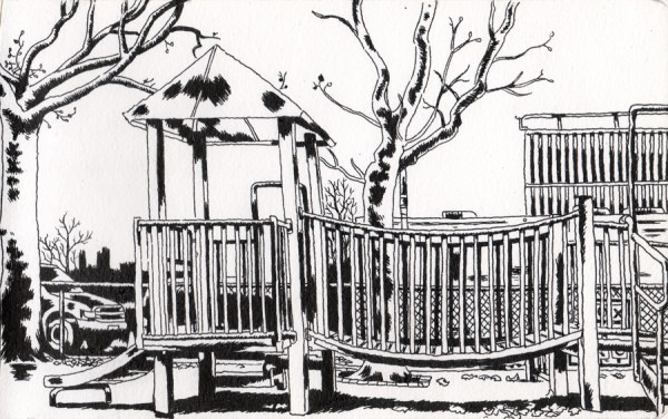 Last Fall I had the idea to do a “drawing of the week” to post on this blog, and started a drawing of a playground near my apartment. I only finished it yesterday. I had a similar idea about a year ago, and I also finished that one months later.  Despite my slow progress I’d like to try to get on the horse again and at least occasionally post some drawings.