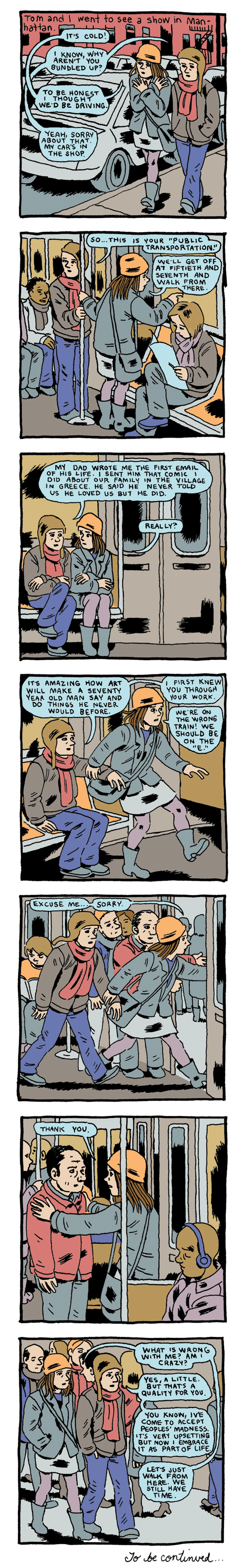 I guess I should explain here that when I originally posted this comic I forgot to have her (me?) wearing the hat in the sixth panel, and upon reading Danny and Martin’s replies, immediately corrected it with ink and photoshop. But I didn’t take the comments down because I just need all I can get, to sort of quote Charles Schulz. So, thanks Danny and Martin!
