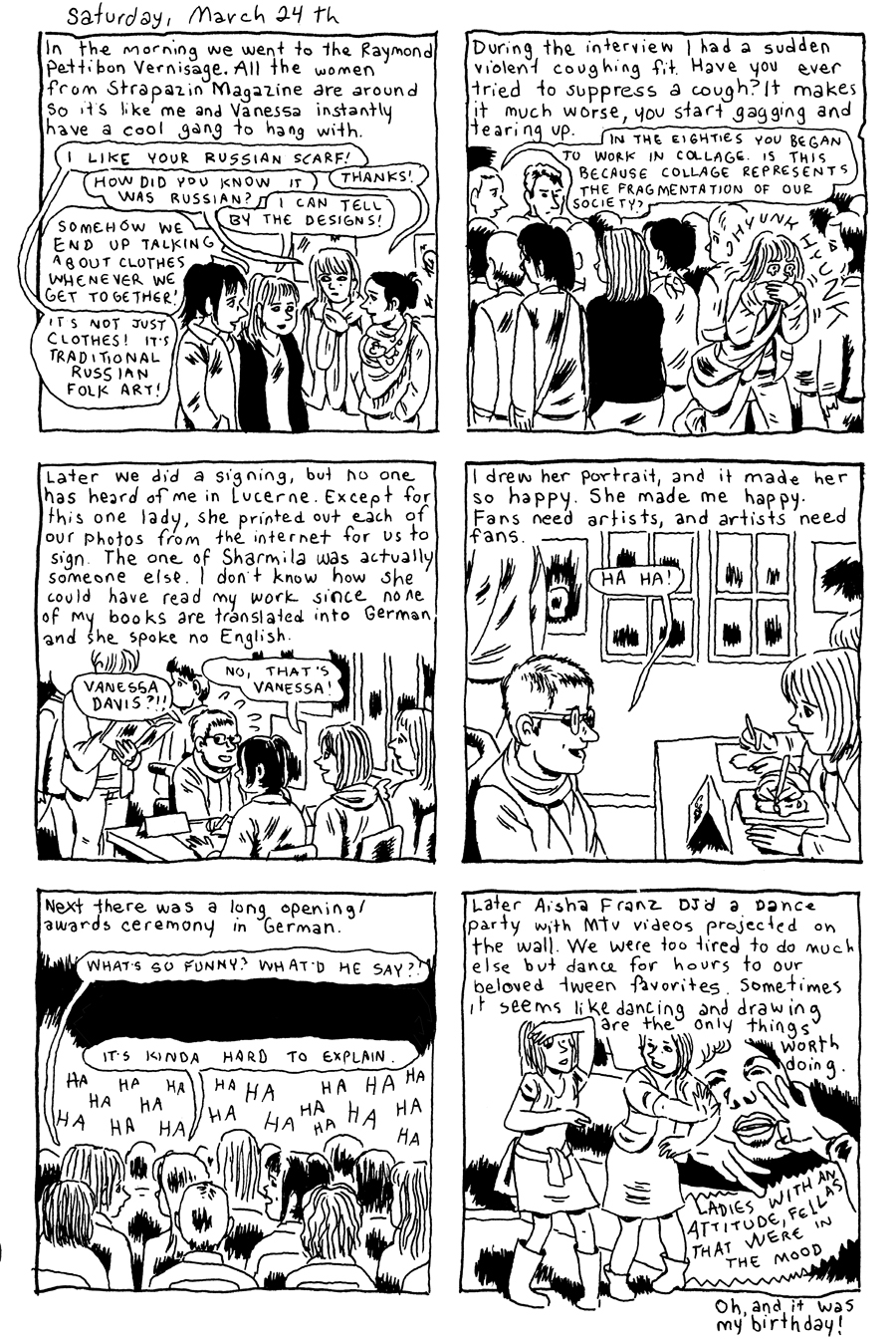I’m very sorry for my crappy drawing/writing, especially to those of you beautiful people, like Ulli Lust, Aisha Franz, Vanessa Davis, Dominique Goblet, Sharmila Banerjee and Raymond Pettibon who I’ve rendered here so poorly. If I haven’t made it clear already, I have a no penciling/redrawing policy for this series. It’s because I get so obsessive. Though I do allow myself some minor photoshop manipulation.  Just so you know.