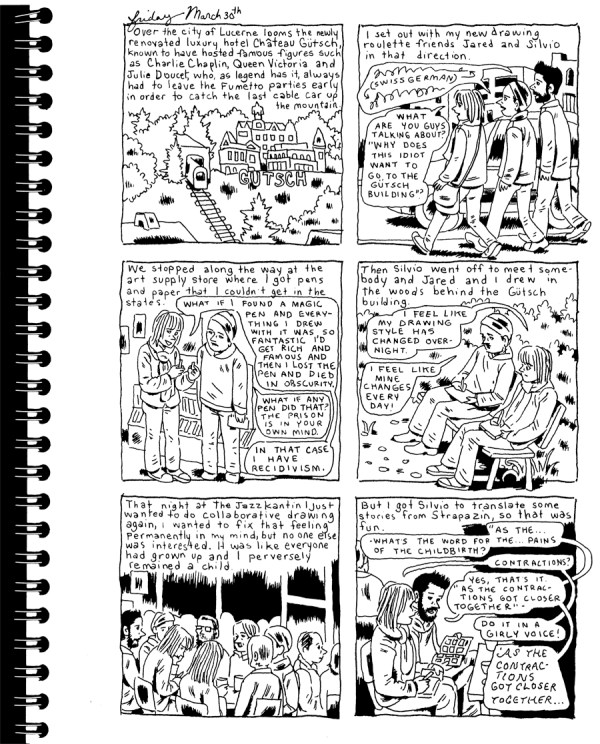 Thanks to Ulli Lust for telling me the story about Julie Doucet. That’s Jared Muralt and Silvio Bruegger of Blackyard, once again, and Silvio is reading me Kati Rickenbach‘s story from Strapazin.