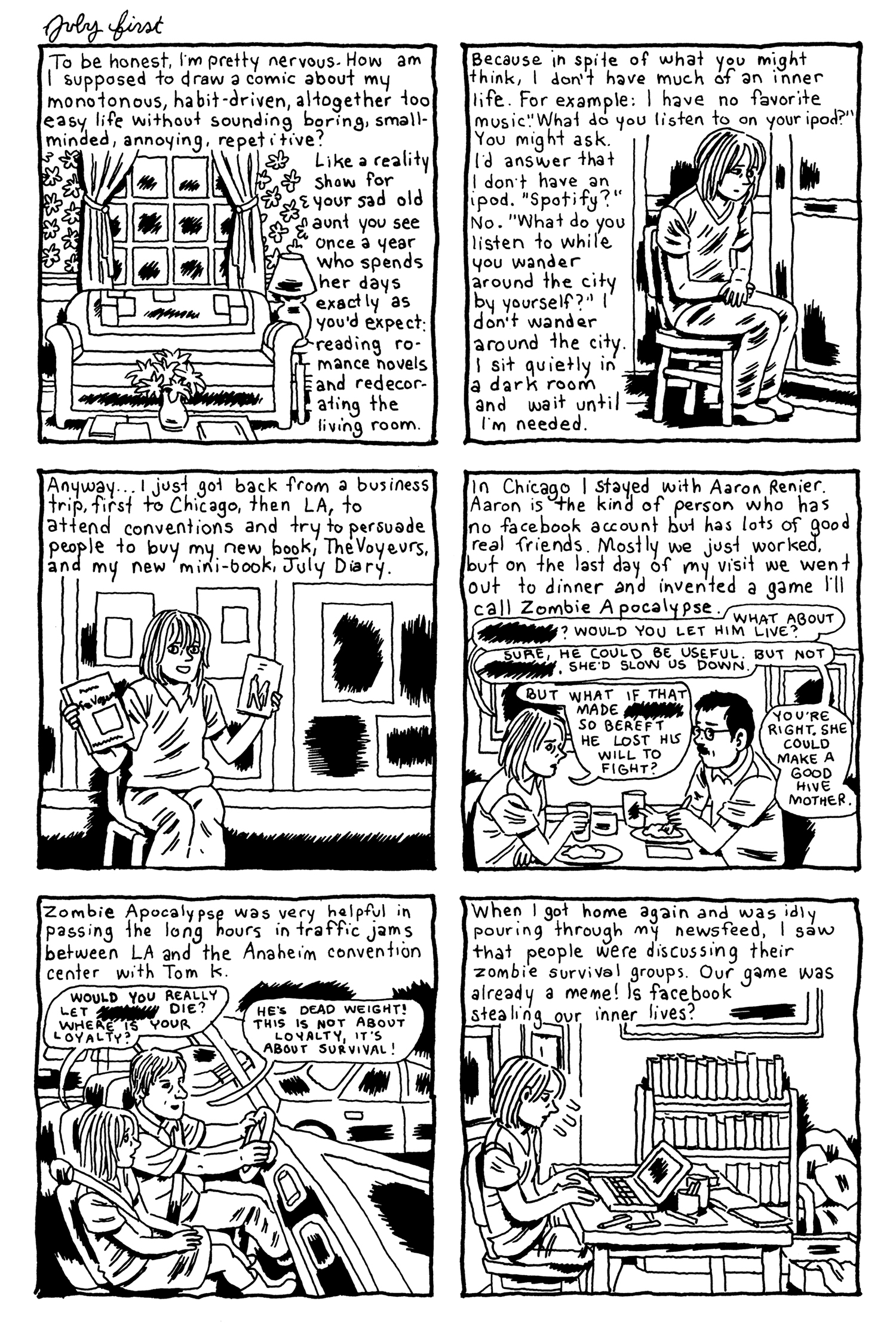 Hello, This is the first day of my 2012 July Diary. I did a comic every day in July last year, and now I’m doing it again. If you want to read last year’s, the minicomic is available here from Uncivilized Books. You can also get it at a discount if you preorder my new book, The Voyeurs.  July Diary 2011 got a very nice review from The Comics Journal’s Robert Clough that you can read here.
