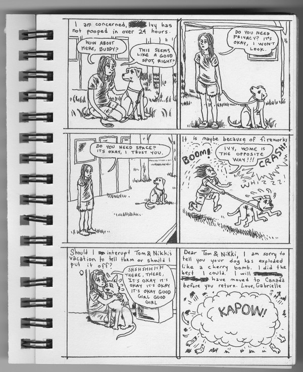 Yes–panel 4!!! It’s sooo scary to walk a dog on the 4th of July in the USA. Our Chessy would be fine until she heard a nearby fire-cracker, then she’d freak out and start running hard. She weighed about a hundred pounds, so there was no way to get her home until she was ready to walk that direction…and then another fire-cracker would explode and it would start over. (She was a rescue dog who had been shot and left for dead, so she had a special fear of explosives.)